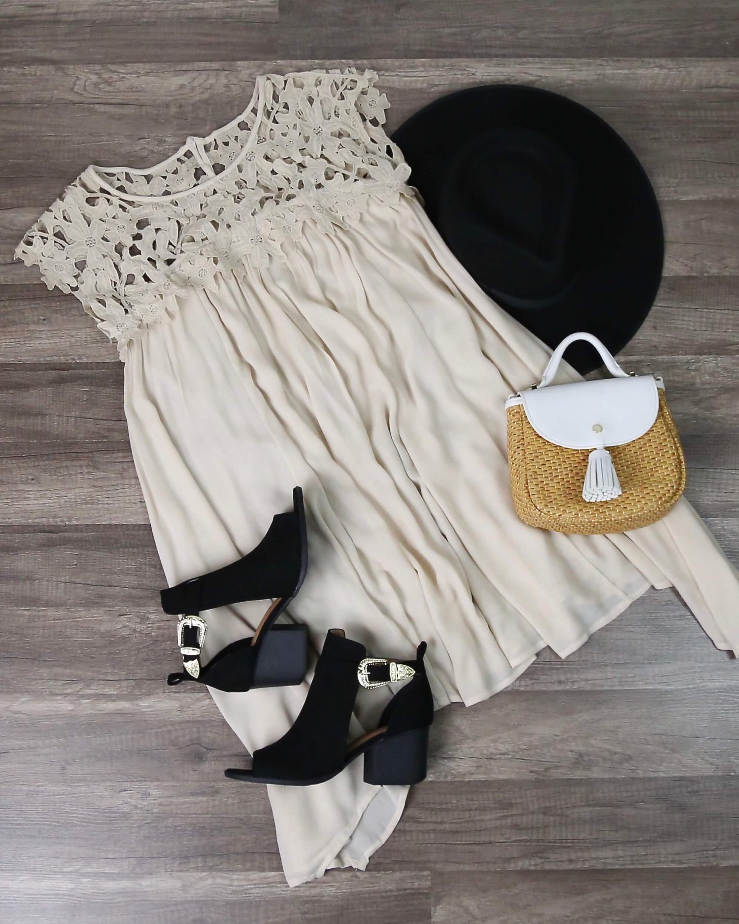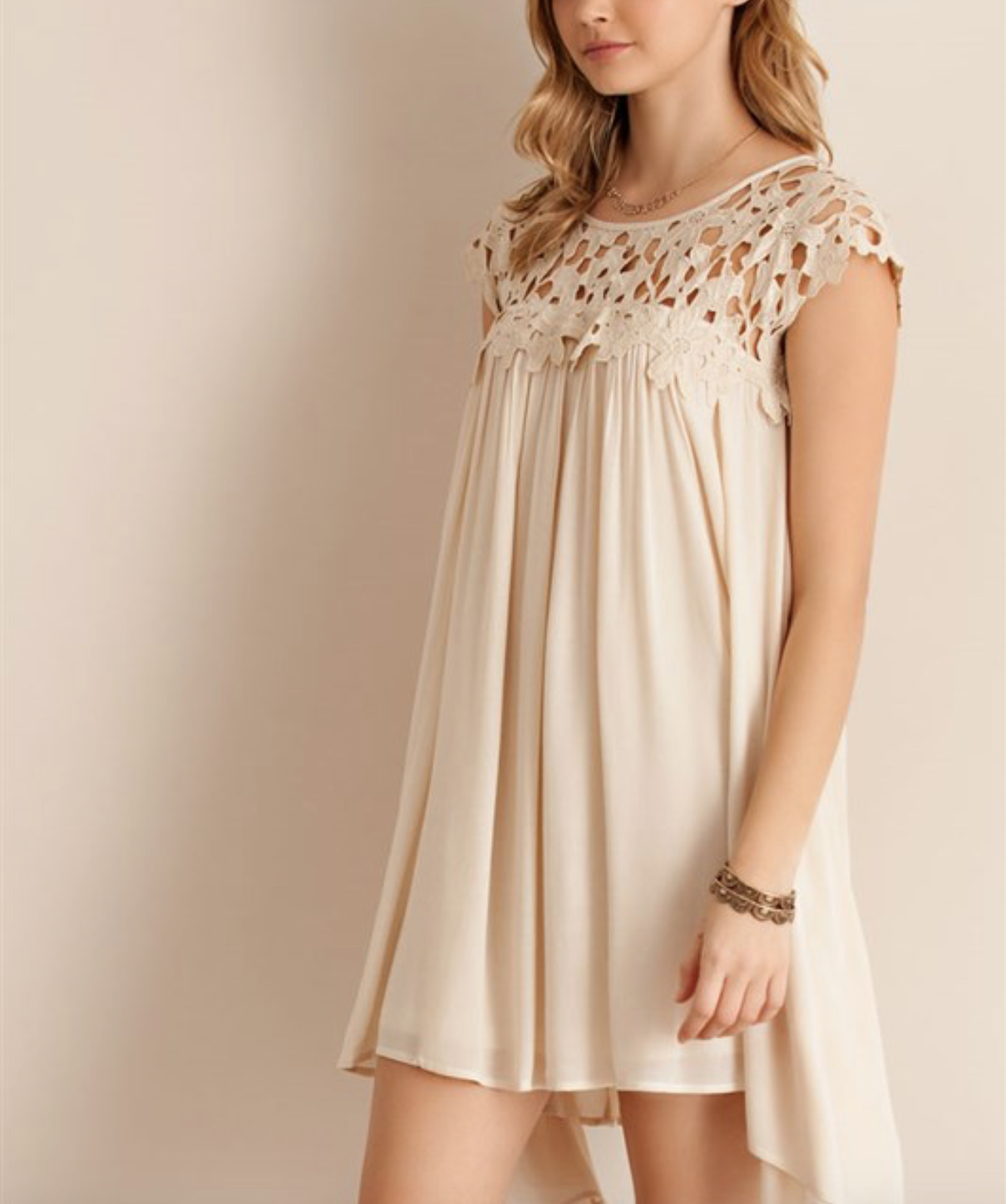 Gorgeous flowy yellow dress that features a pleated front, cap sleeves, and a sheer yoke upper.